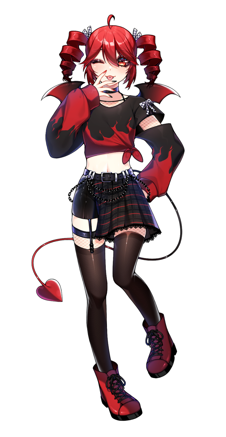 androgynous/feminine characters, goth/punk attire, single character themed illust, modern fashion/cyber fashion, accessories, detailed eyes, nails, yanderes, blood.